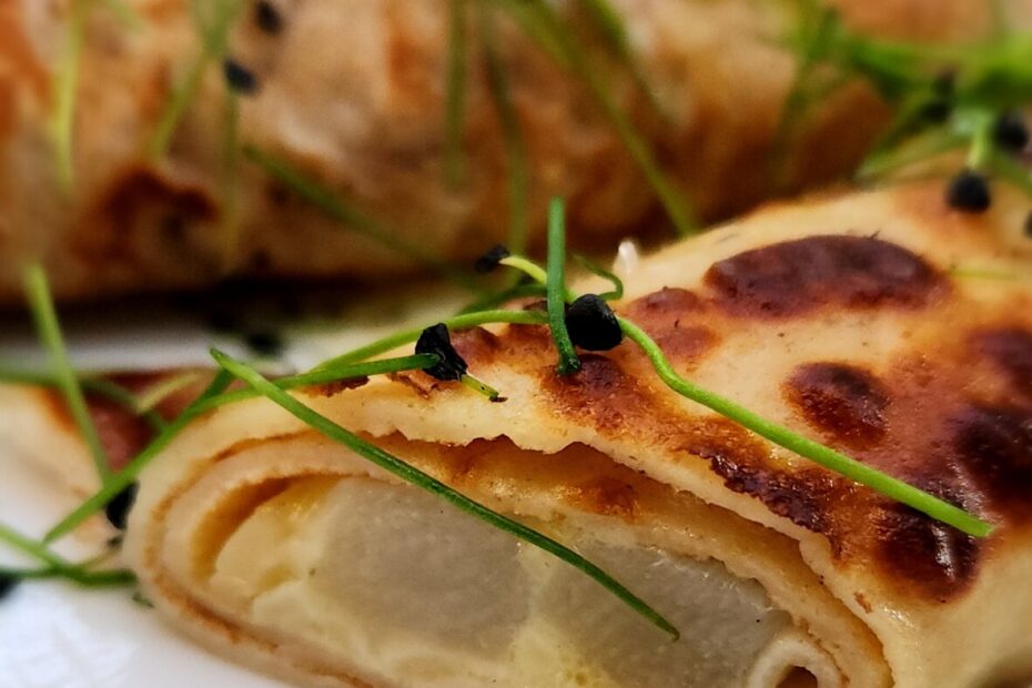 Die Inspiration stammt von Carmen und diese wiederum von ihrer Kommilitonin Pascale. Pfannkuchen aus Emmermehl, gefüllt mit weißem Spargel, einer Art Sauce Bernaise und etwas geriebener Käse.