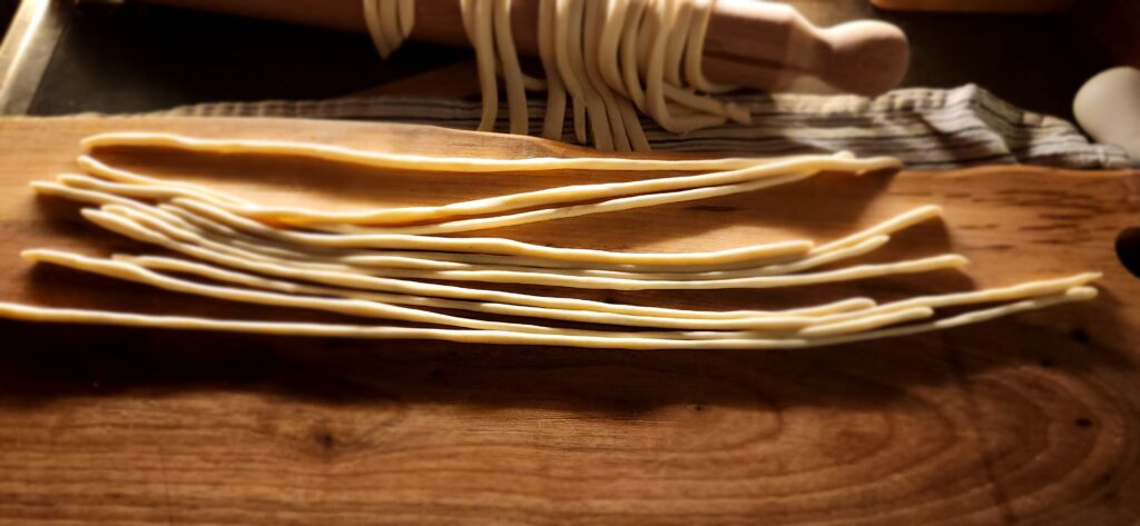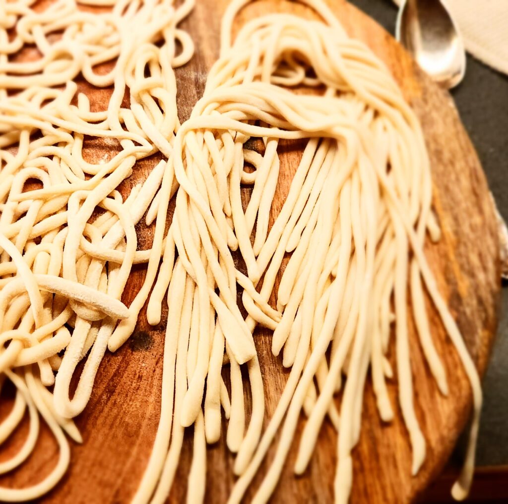 Pici kommen aus der südlichen Toscana, aus der Region um Siena – Montepulciano. Ich hab die das erste Mal in den 90ern in Siena gegessen. Lecker mit einem Wildschweinragout. Pici sind doch recht rustikale Pasta, man macht zwar jede Nudel einzeln, aber es geht so einfach und schnell.